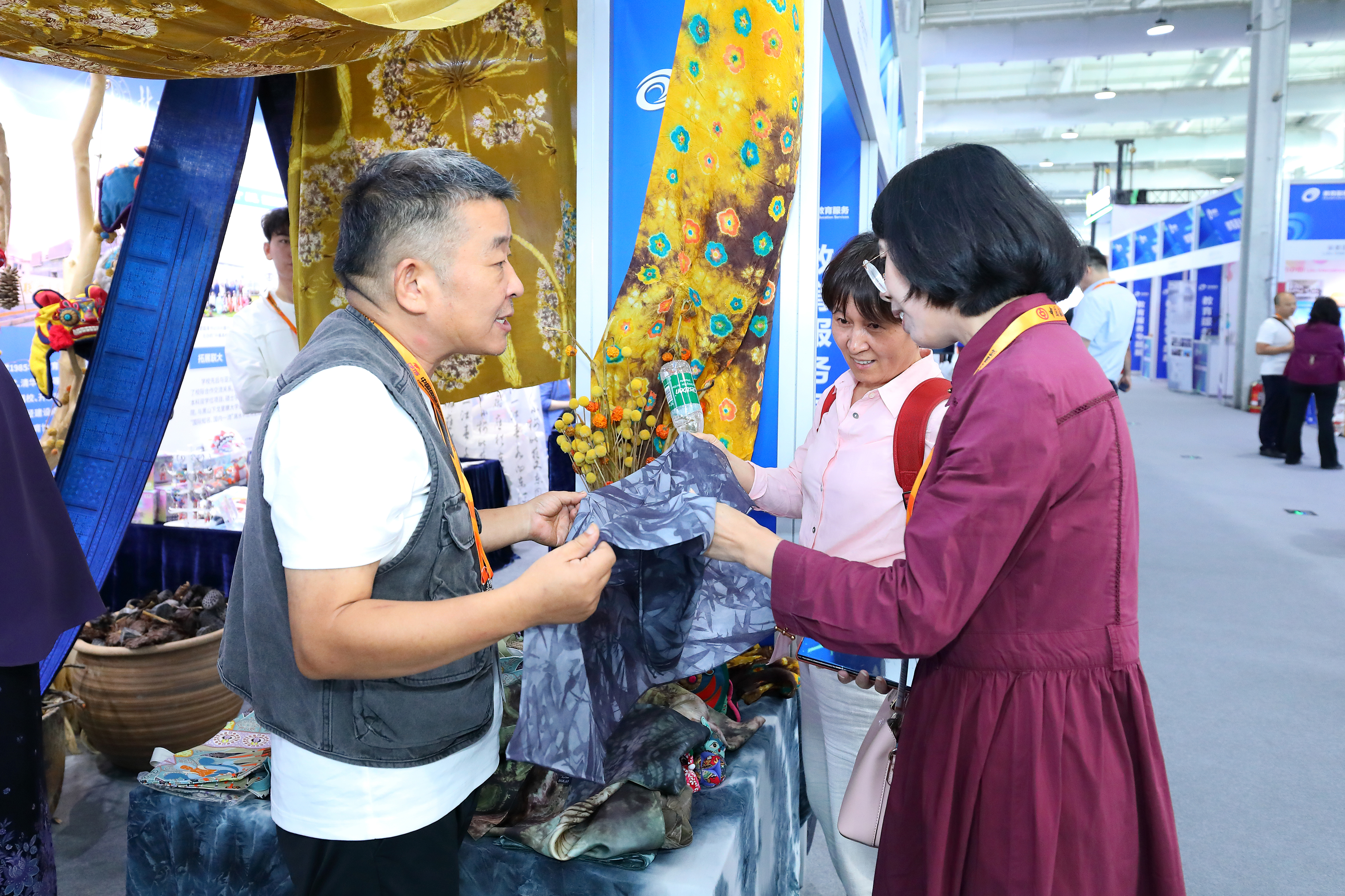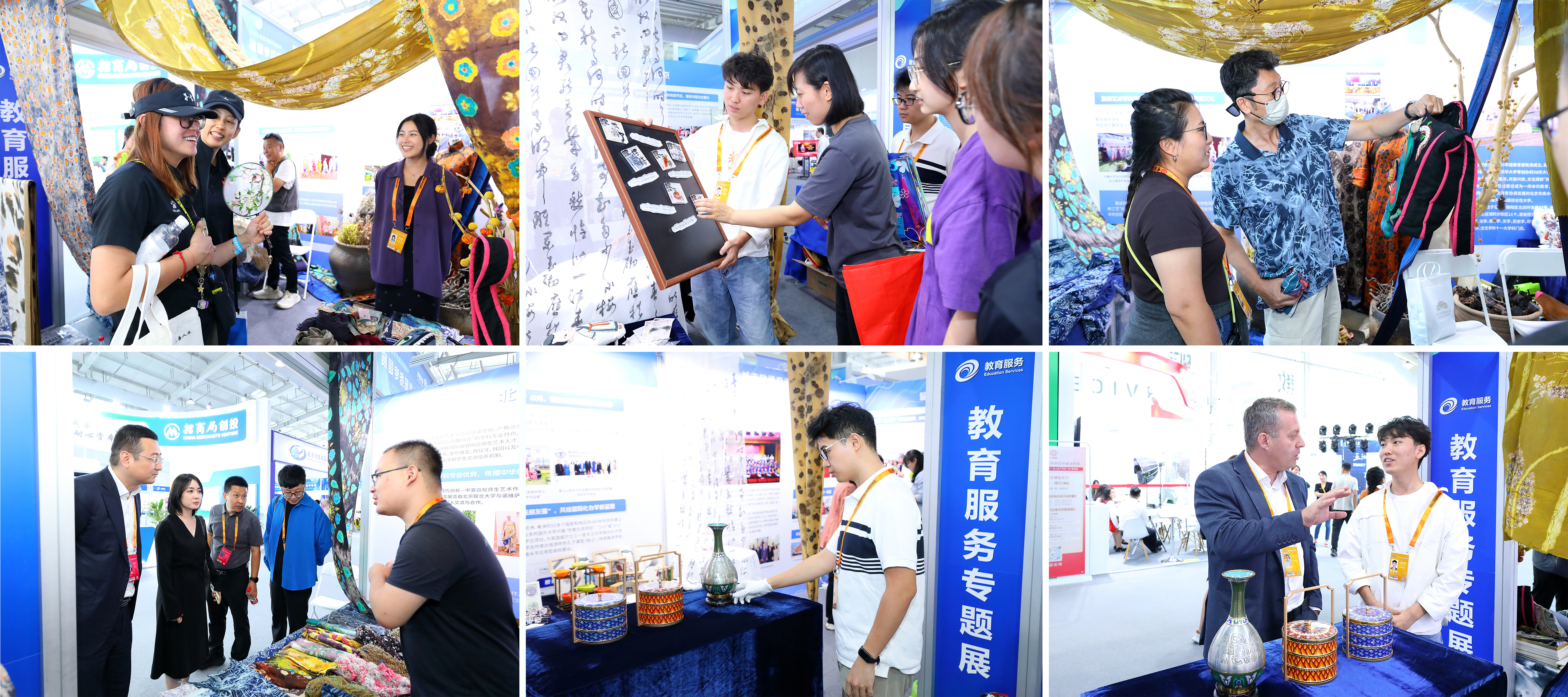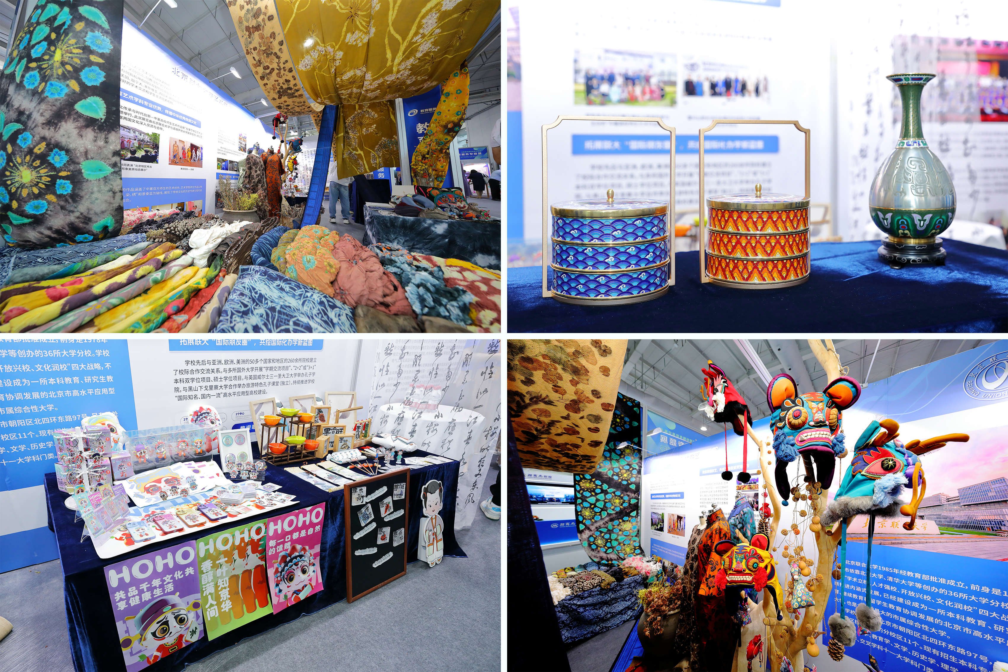 在今年的服贸会展台上,我校设置了专门的展位。艺术学院师生展出的非遗染缬、视觉传达专业毕业生优秀毕设作品和非遗国礼景泰蓝成为了新的亮点。创意十足的展台搭建、五彩缤纷的非遗染缬作品、繁缛华丽的景泰蓝和时尚多元的文创产品吸引了众多观展人员和艺术爱好者驻足。